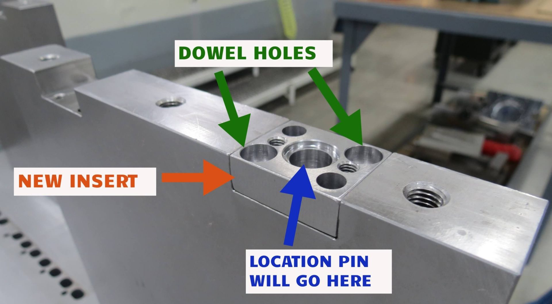 We machine opened the dowel block and installed replaceable inserts with dowel holes. These hardened inserts established a more solid base for the dowel holes and pins to align. The newly designed center hole on this insert will improve line up with the location pin on the tooling. Ultra’s customized solution included redesigned dowel pins composed of a hardened liner. The end surface of the dowel pins is now curved allowing for better lead-in and fit into the dowel hole.