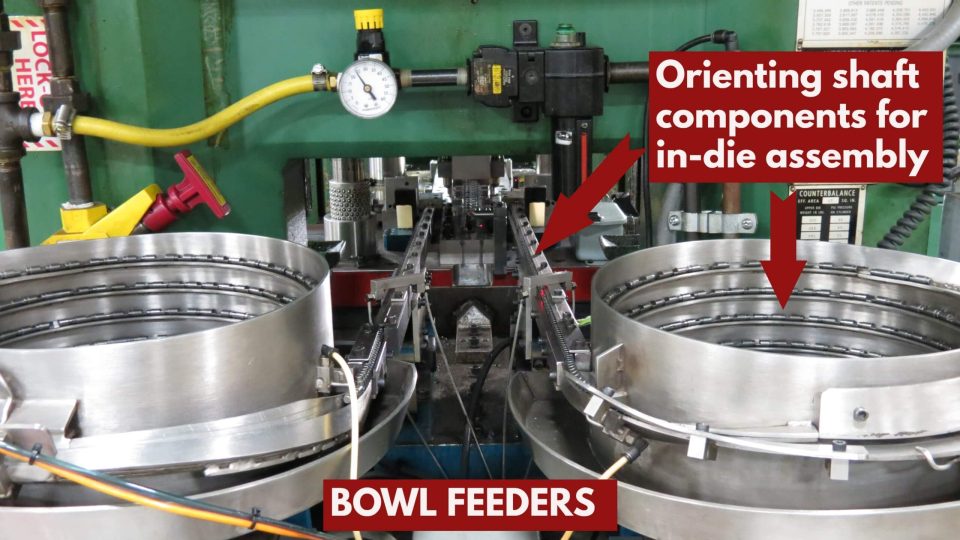 2. Bowl feeders located on the stamping press align and feed the shaft components into the progressive stamping die for assembly.